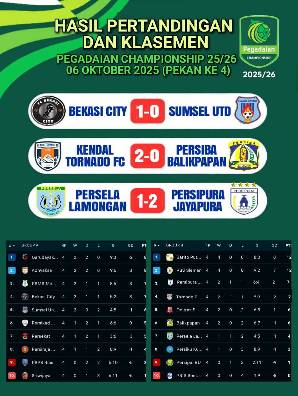 Sementara itu, di Grup A, FC Bekasi City kembali ke jalur kemenangan dengan menaklukkan Sumsel United dengan skor 1-0. Hasil ini membuat Bekasi City melompat ke posisi 4 Grup A dengan 7 poin, terpaut tipis dari PSMS Medan (7 poin), Adhyaksa (8 poin), dan pemuncak klasemen sementara, Garudayaksa FC (8 poin).