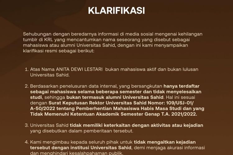 Melalui akun Instagram resminya, Usahid mengklarifikasi bahwa individu yang dikenal dengan nama Anita, pemilik akun Threads @anitadwdl, bukanlah bagian dari civitas akademika mereka. Pihak universitas segera merilis pernyataan resmi untuk menanggapi simpang siur informasi yang beredar, terutama yang mengaitkan institusi mereka dengan kasus viral tumbler Tuku di KRL.